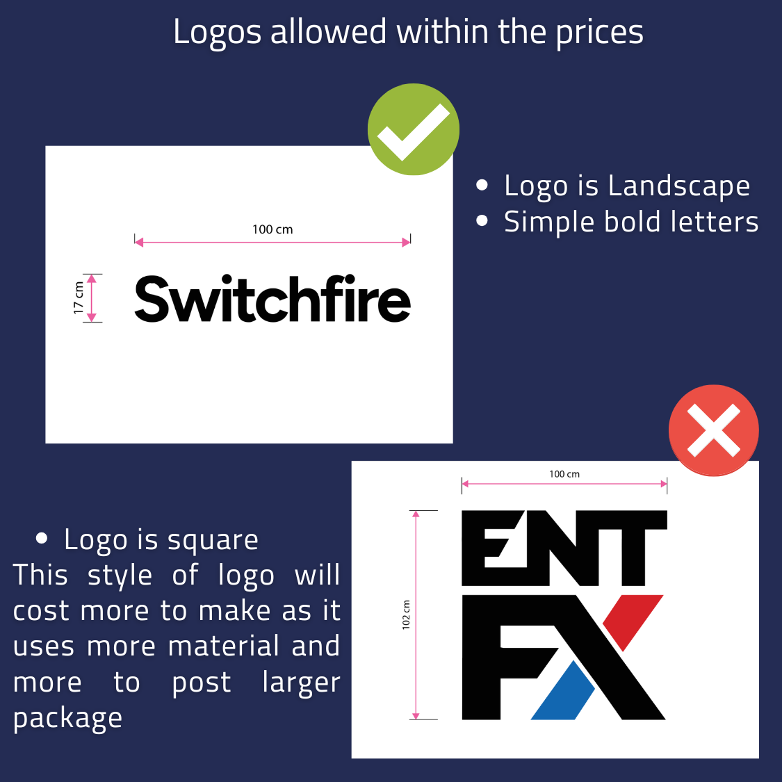 Large shapes in the logo over 1m, or designs that have text all connected - could also cost more to make and post - See more info here. You can always email us for mock up and a custom quote.
